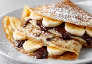 Imagínate unas crepas calientitas, rellenas de plátano con chocolate, coronadas con azúcar glass cayendo como nieve dulce… 😍