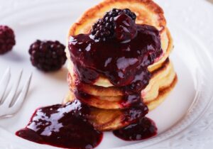 Hotcakes esponjositos, calientitos y bañados con mermelada natural de zarzamora… así empieza un día feliz.